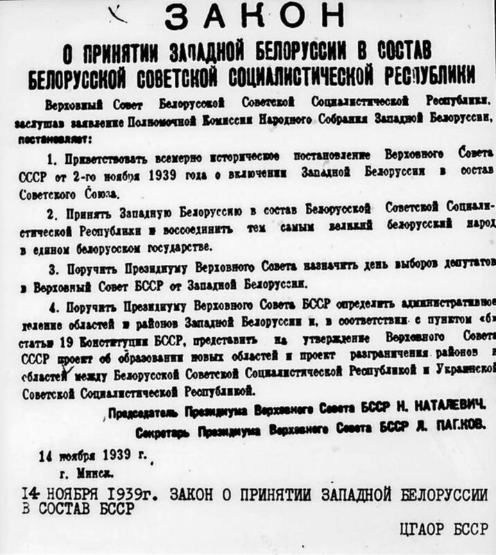 2 ноября 1939 года внеочередная V сессия Верховного Совета СССР первого созыва решила удовлетворить просьбу Народного собрания Западной Беларуси и включить Западную Беларусь в состав СССР с объединением ее с Белорусской ССР. Принятие внеочередной III сессией Верховного Совета БССР 14 ноября 1939 года закона «О принятии Западной Беларуси в состав Белорусской Советской Социалистической Республики» явилось заключительным законодательным актом.