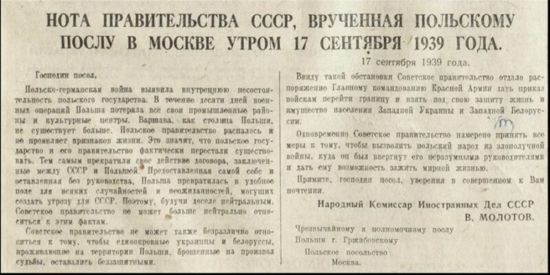 Утром 17 сентября польскому послу в Москве была вручена нота правительства СССР. В ней говорилось, что в итоге польско-германской войны Польское правительство распалось, утеряны все промышленные районы и культурные центры, а Варшава, как столица Польши, больше не существует. Это все означало, что польское государство и его правительство фактически перестали существовать. Тем самым прекратили свое действие договоры, заключенные между СССР и Польшей. Ввиду такой обстановки советское правительство отдало распоряжение Главному командованию Красной армии дать приказ войскам перейти границу и взять под свою защиту жизнь и имущество населения Западной Украины и Западной Беларуси.