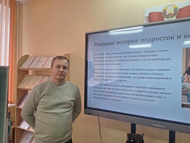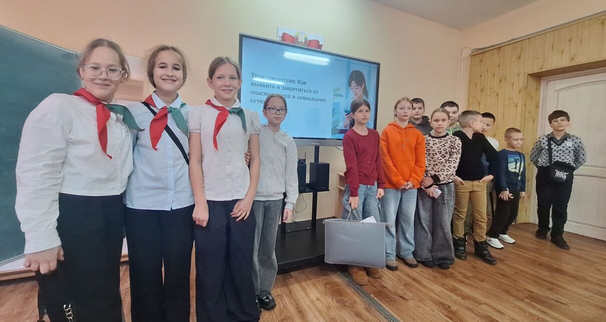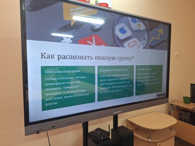 После просмотра началось живое обсуждение. Ребята вместе с руководителем по военно-патриотическому воспитанию разбирали конкретные примеры опасных сообществ и манипулятивных техник, которые используются для вовлечения детей в деструктивные группы.