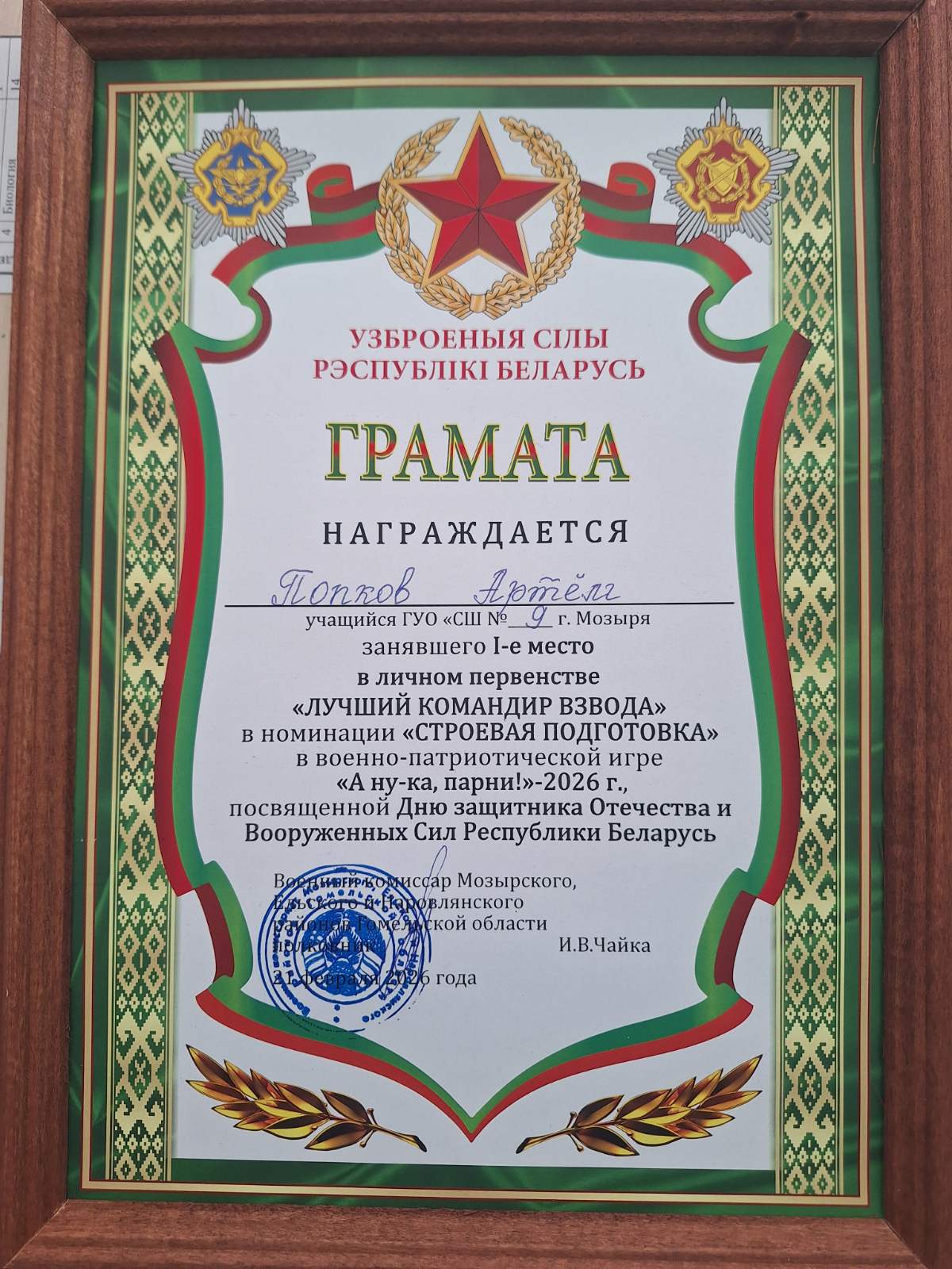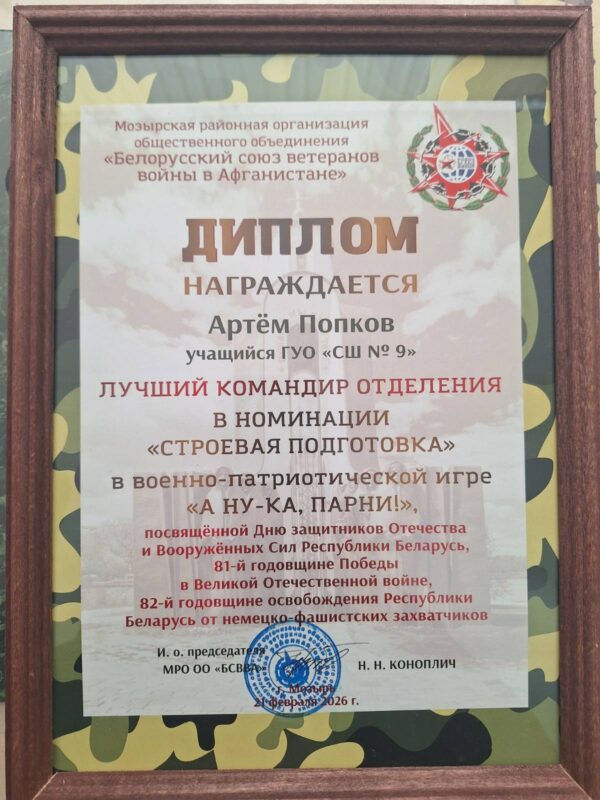• В номинации «Строевая подготовка» звания «Лучший командир отделения» был удостоен Попков Артём, учащийся 10 «А» класса.