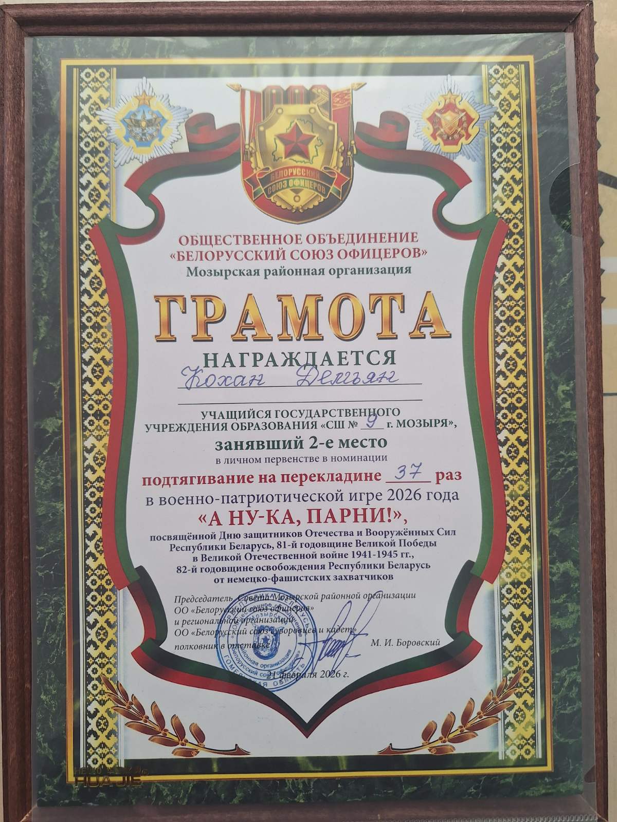 • В номинации «Подтягивание на перекладине» дипломом 2 степени был награжден Кохан Демьян, учащийся 10 «Б» класса.