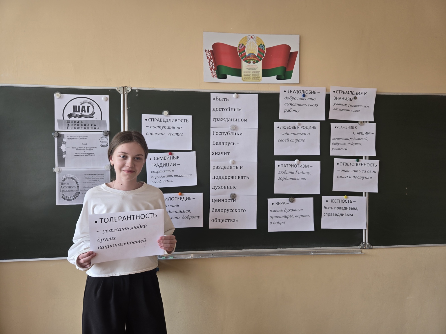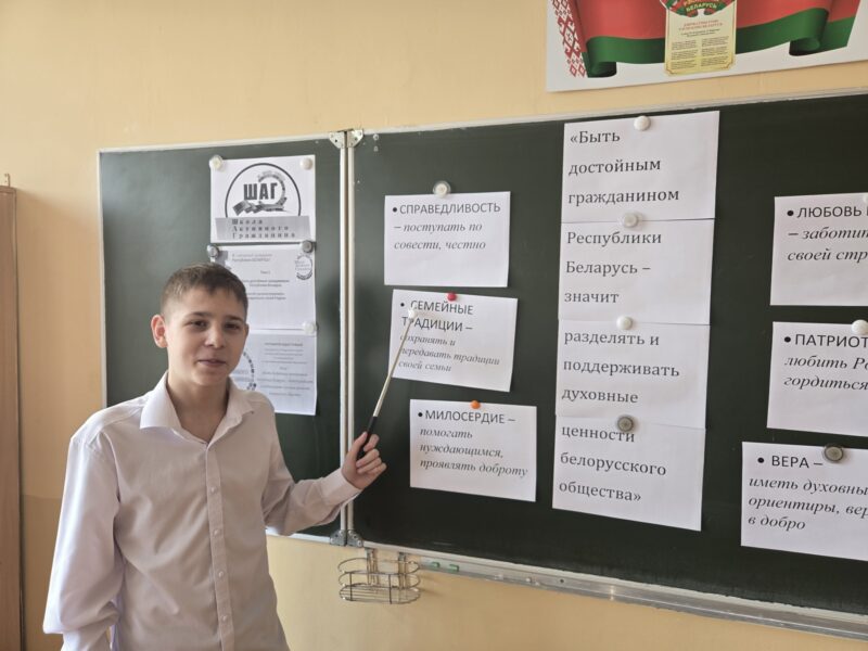 31 марта в нашей школе для учащихся 8–11 классов прошёл информационно-образовательный проект «ШАГ» — «Школа Активного Гражданина». Тема встречи звучала очень значимо: «Быть достойным гражданином Республики Беларусь – значит разделять и поддерживать духовные ценности белорусского общества».
