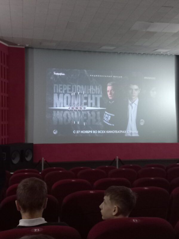 В шестой школьный день учащиеся 6 «В» класса нашей школы посетили кинотеатр «Мир» с целью просмотра кинофильма «Переломный момент» — это новая белорусская спортивная драма от «Беларусьфильм», рассказывающая о подростке-гребце Артёме, который после падения и травмы собирает новую команду «изгоев».