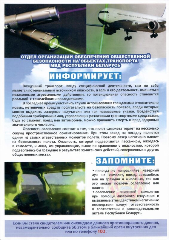 В Республике Беларусь за игры с лазерными указками, которые могут причинить вред другим людям, а в случае использования в отношении воздушных судов привести к авиакатастрофе, предусмотрена уголовная ответственность, наступающая с 14-ти лет и содержащая признаки следующих преступлений: