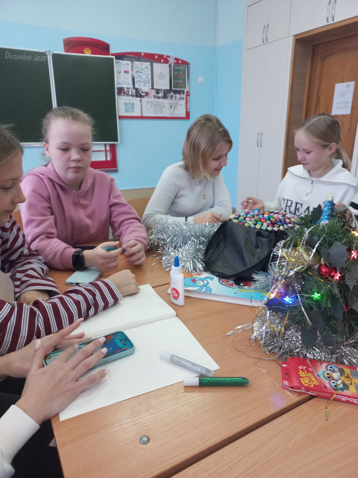 Учащиеся 6 «В» класса приняли участие в мастерской зимних чудес «Создаем атмосферу праздника». Школьники собрались в этот день, чтобы подготовить красочные новогодние открытки для своих близких, а также для ветеранов педагогического труда. Все творческие работы найдут своих адресатов и принесут много радости в эти праздничные дни.