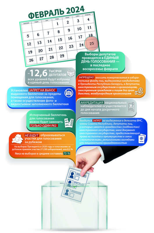 Единый день голосования в Беларуси пройдет 25 февраля 2024 года. Избираться будут депутаты Палаты представителей Национального собрания восьмого созыва и местных Советов депутатов двадцать девятого созыва.
